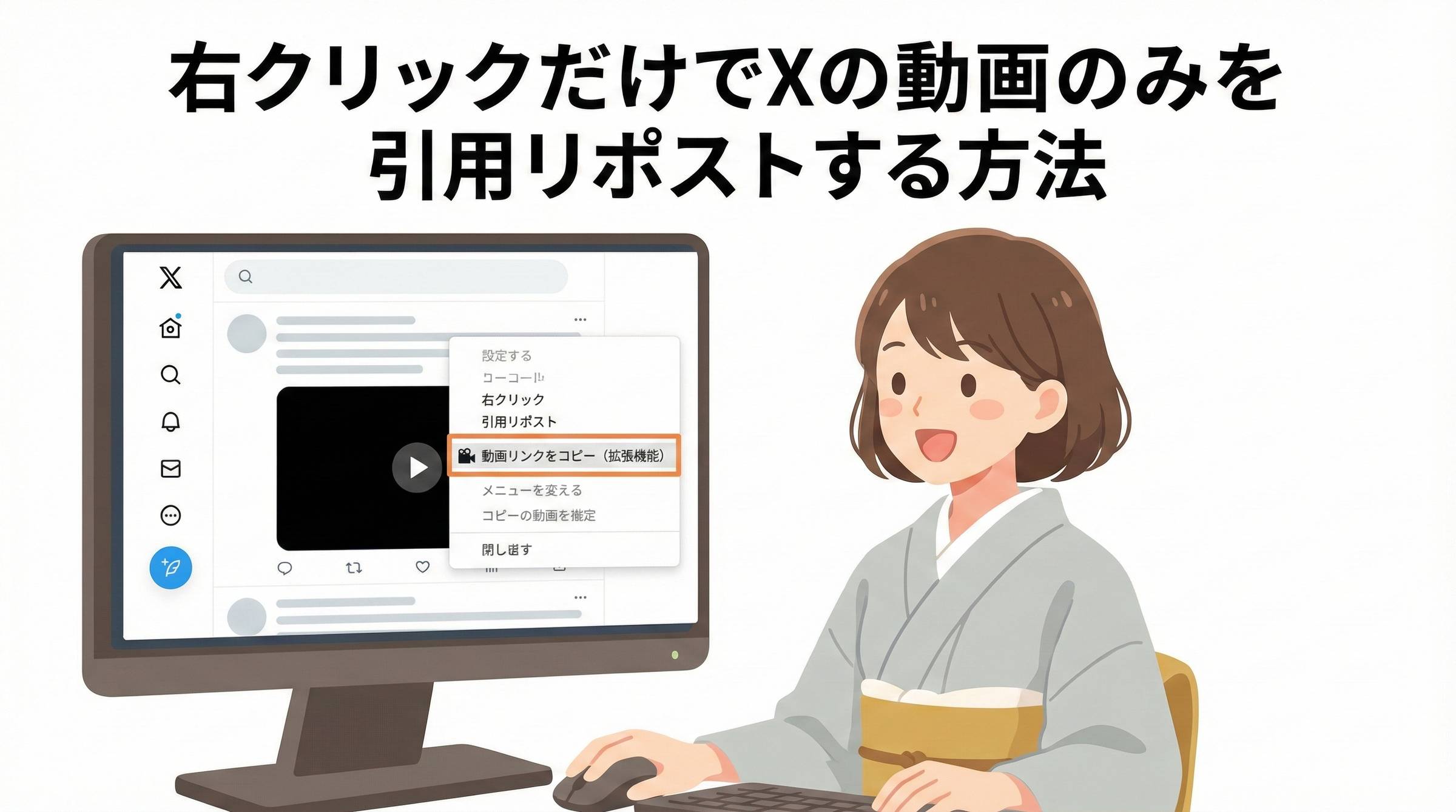 ウミノ@AI×マーケティングの専門家 右クリックだけでXの動画のみを引用リポストする方法 Readerさん、こんにちは!ウミノです。 こういうXの投稿、みたことありますか? これはもともとChromeのアカウントがポストした動画投稿なんですが、それをわたしが、動画だけを強調してリポストしています。 ちなみに動画の上で右クリックすると「動画のアドレスをコピー」って出るんですが、実際はただの投稿リンクがコピーされるというバグがもうずっと残ってます。 (スマホだと長押しでできるんですけどね) この記事では、PCで動画を強調してリポストする方法を解説します。 やり方はかんたんで、元投稿リンクの末尾に「/video/1」を足すだけ。 たとえばChromeの元の投稿のリンクは https://x.com/googlechrome/status/1993001667948597578 ですが、それをhttps://x.com/googlechrome/status/1993001667948597578/video/1 にするだけ。 こちらで練習してみてください。 使用上の注意...