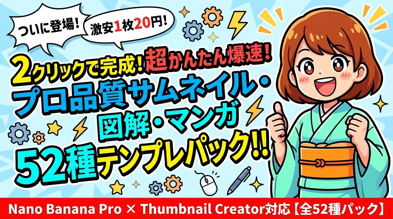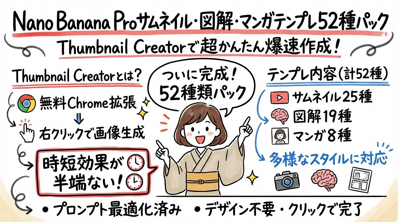 ウミノ@AI×マーケティングの専門家 【発売開始】Thumbnail Creatorテンプレパック52種類 Readerさん、こんにちは!ウミノです。 今日はメール多くてごめんなさい🙏お待たせしました! Thumbnail Creator用テンプレート52種パック、ついに発売開始です! 2480円ですのでお気軽にポチッとしてください。 買ってみたけど自分の用途には使えなかった、という場合はnote経由で返金できるようにしています。 (ただしメンバーシップ経由で購入された場合は返金できない仕様なのでご注意ください) 何ができるの? 図解やサムネイル、マンガにしたい記事で右クリックして「Thumbnail Creatorで画像を作る」を選びます。 気に入ったテンプレートの生成ボタンを押せば、わずか数クリックでプロ品質の画像が完成します。 これでできたサムネイルです👇️ 1枚生成するのにかかるAPI料金はだいたい20円〜30円くらい。激安です。 中身は? サムネイル25種:YouTube風、Brain風ギラギラ系、シンプル系、アメコミ風、ビジネス系...