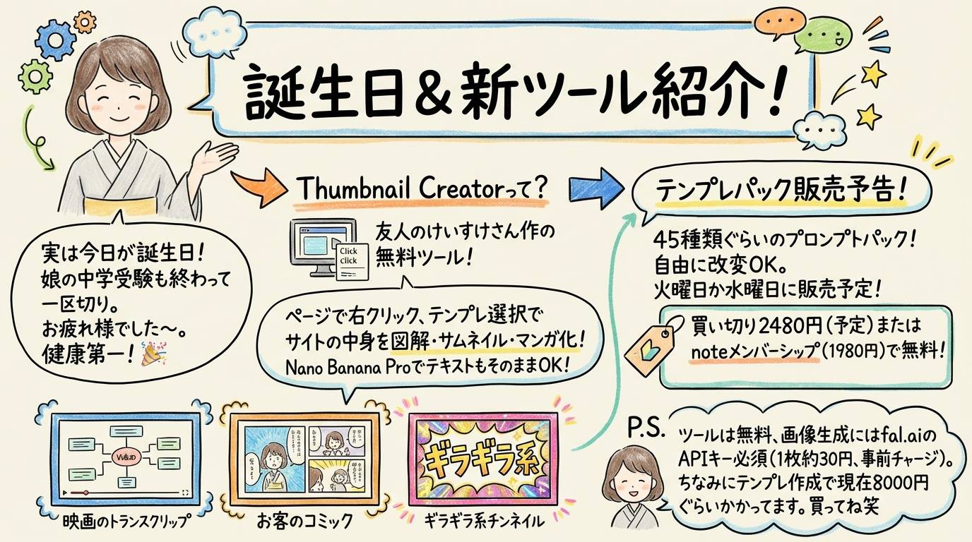 ウミノ@AI×マーケティングの専門家 サムネや図解、マンガがすぐにできちゃうテンプレ Readerさん、こんにちは!ウミノです。 実は今日が誕生日なんです〜🎉 まぁこの年になると誕生日もうれしいものでもないのですが笑 ちょうど娘の中学受験も無事終わりました(帰国生なので早め)あぁ疲れた…ようやく一区切りがつきました。 年も重ねたことですし、これからはもっと健康に気を使っていこうと思います。 Thumbnail Creatorって知ってる? 友人のけいすけさんがすごい便利な無料ツールを作ってました。その名もThumbnail Creator(サムネイルクリエイター)! ページで右クリックして開いてテンプレを選べば、そのサイトの中身を参考に図解やサムネイル、マンガが作れちゃうんです。 Nano Banana Proなのでテキストも手直し不要! たとえばこんな感じです。これは動画の文字起こしを入れました。 ウミノ🤖AI×マーケティングのプロ @umino_chibi...