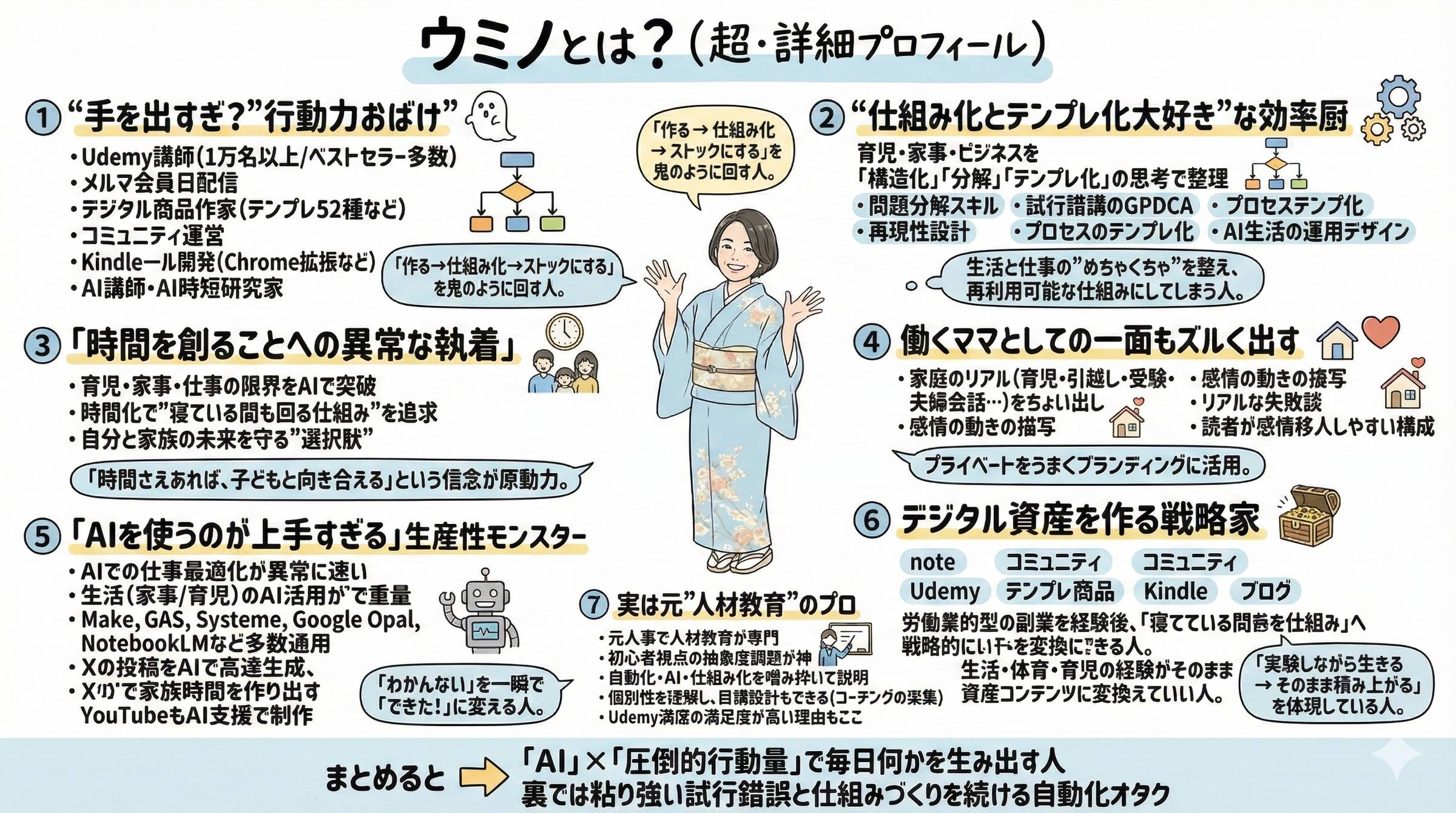 ウミノ@AI×マーケティングの専門家 グラレコ風自己紹介プロンプト Readerさん、こんにちは!ウミノです。 いきなりどどーんとのせちゃいましたが、グラレコ自己紹介、いいと思いませんか? グラレコ自己紹介の作り方ステップ1:ChatGPTにテキストをまとめてもらう 普段からChatGPTを使いまくっている方は、以下のプロンプトを投げるだけでOKです。長いのでXの投稿を貼ります👇️ ウミノ🤖AI×マーケティングのプロ @umino_chibi プロンプトはこちら👇️ # 命令 あなたは「プロフェッショナルなグラフィックレコーダー」兼「人物プロファイラー」です。 以下の[対象者の情報]を元に、その人物の魅力を立体的に伝えるための「グラレコ用・超詳細プロフィール構成案」を作成してください。 # 出力ルール - ウミノ🤖AI×マーケティングのプロ @umino_chibi...